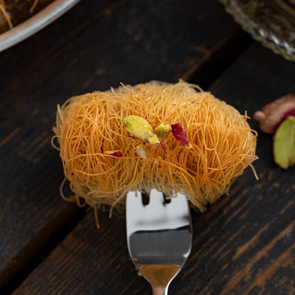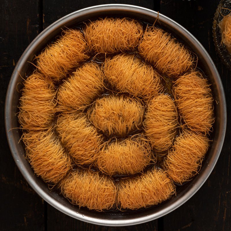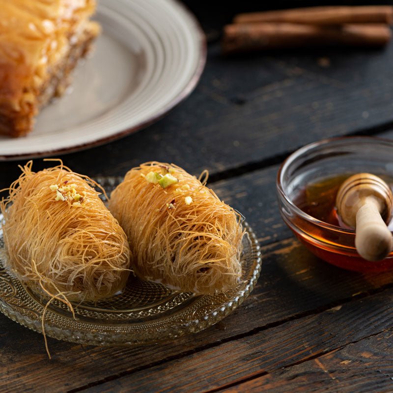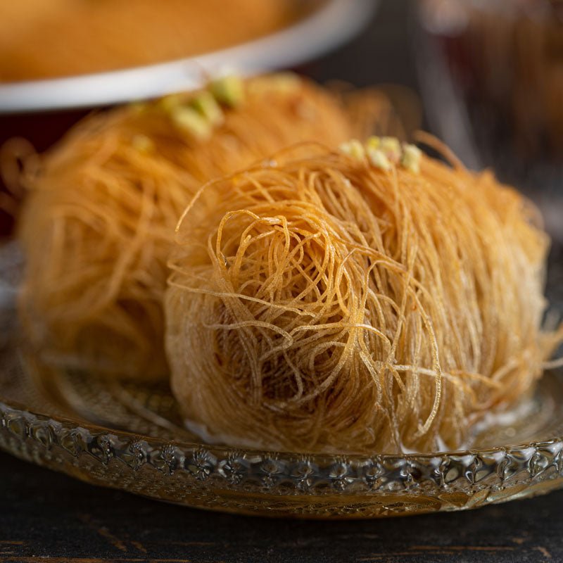 Kataifi ist eines der bekanntesten Desserts der griechischen Küche – eine wahre Verbindung aus Handwerkskunst, Tradition und Genuss. Feinste, goldbraune Fäden aus knusprigem Teig – ähnlich Engelshaar – umhüllen eine aromatische Füllung aus gehackten Pistazien, Zimt und Gewürznelken. Ein Hauch von Zitronensirup rundet das Dessert perfekt ab und sorgt für ein ausgewogenes Zusammenspiel von Süße, Aroma und Frische.
