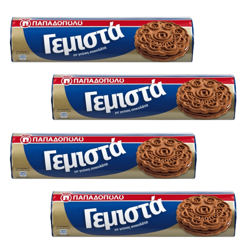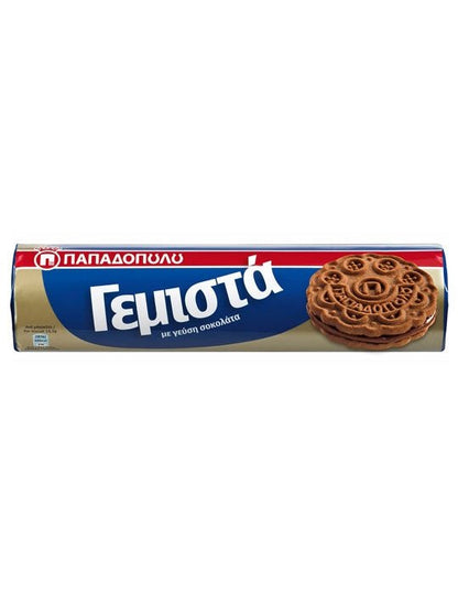 Gemista Papadopoulos sind die beliebtesten griechischen Kekse, die uns seit Jahren mit jedem Bissen einen einzigartigen Geschmack bescheren. Sie werden seit fast einem Jahrhundert nach dem authentischen Rezept der Familie Papadopoulos hergestellt. Der Grund, warum jeder diese Kekse liebt, ist ihre sehr reichhaltige und schmackhafte Schokoladencremefüllung. Genießen Sie sie mit einem Glas Milch oder nehmen Sie eine Packung mit ins Büro und haben Sie jeden Moment des Tages einen leckeren süßen Snack zum Genießen!