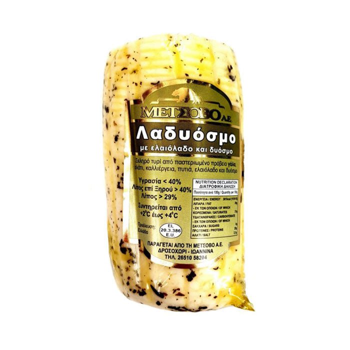 Ladiosmo von Metsovo ist ein in Epirus hergestellter Hartkäse , der sich perfekt mit Tsipouro und Ouzo kombinieren lässt. Angereichert mit Olivenöl und Minze verleiht es jedem Anlass einen einzigartigen Geschmack. Genießen Sie seine 300-g-Größe mit der bekannten Metsovo-Qualität .