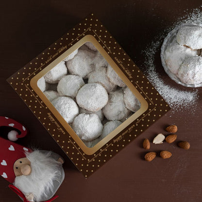 Αυτοί οι κουραμπιέδες παρασκευάζονται σε παραδοσιακό εργαστήριο στην Αθήνα, με συνταγή που περνά από γενιά σε γενιά: ποιοτικό βούτυρο, καβουρδισμένα αμύγδαλα και αργή, προσεγμένη διαδικασία που χαρίζει υφή που λιώνει στο στόμα και άρωμα ζεστό και γιορτινό. Κάθε μπουκιά είναι μια πρόσκληση για μοιρασιά, ζεστασιά και απόλαυση.