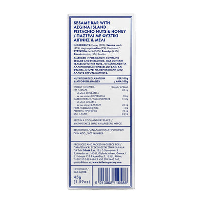 Ingredients: honey (50%), sesame seeds (44.9%),  Aegina pistachios (5%), cinnamon citrus fibre.