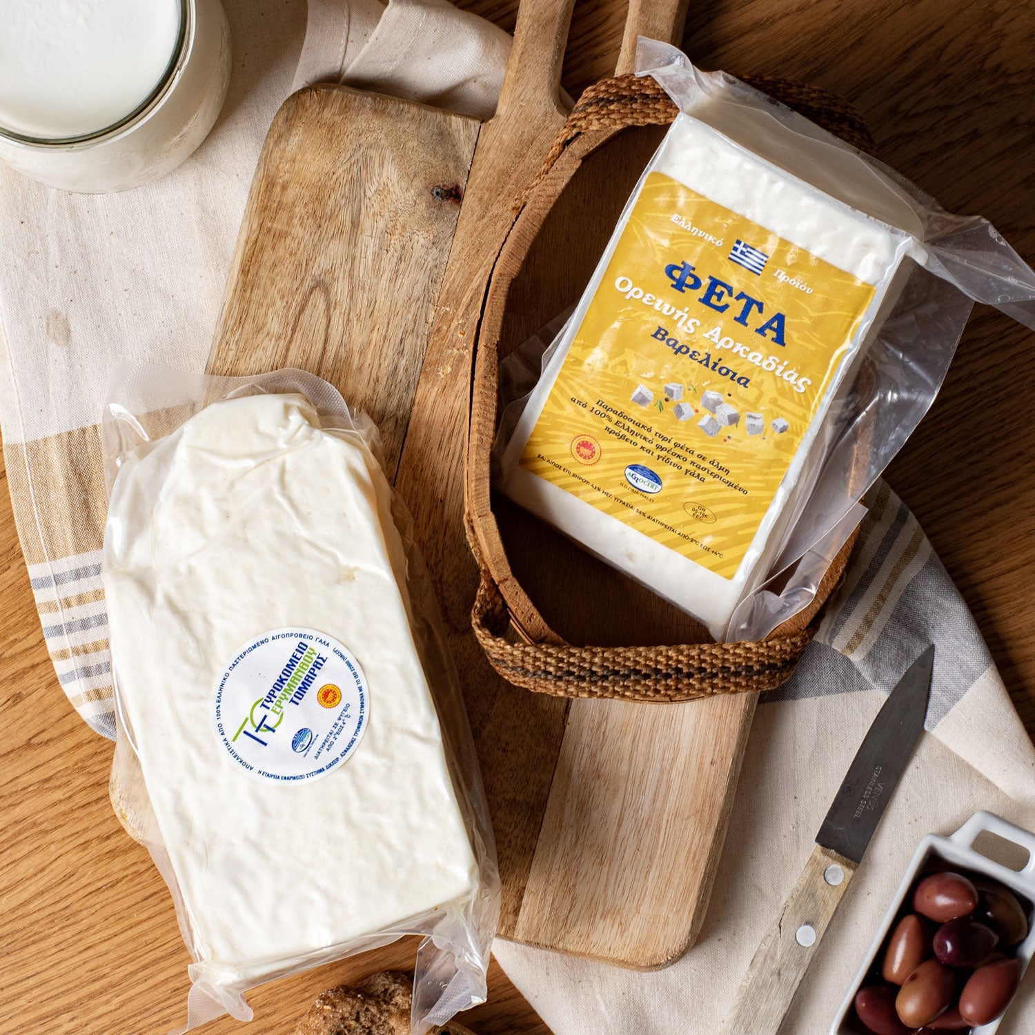 Aproveche la oportunidad de degustar los tipos de queso feta más tradicionales envejecidos en barriles de madera. Le ofrecemos 1 paquete de Erymanthos y 2 de Arcadia, cada uno con su textura y sabor únicos. Si es del Peloponeso, ¡seguro que se lleva el auténtico feta!