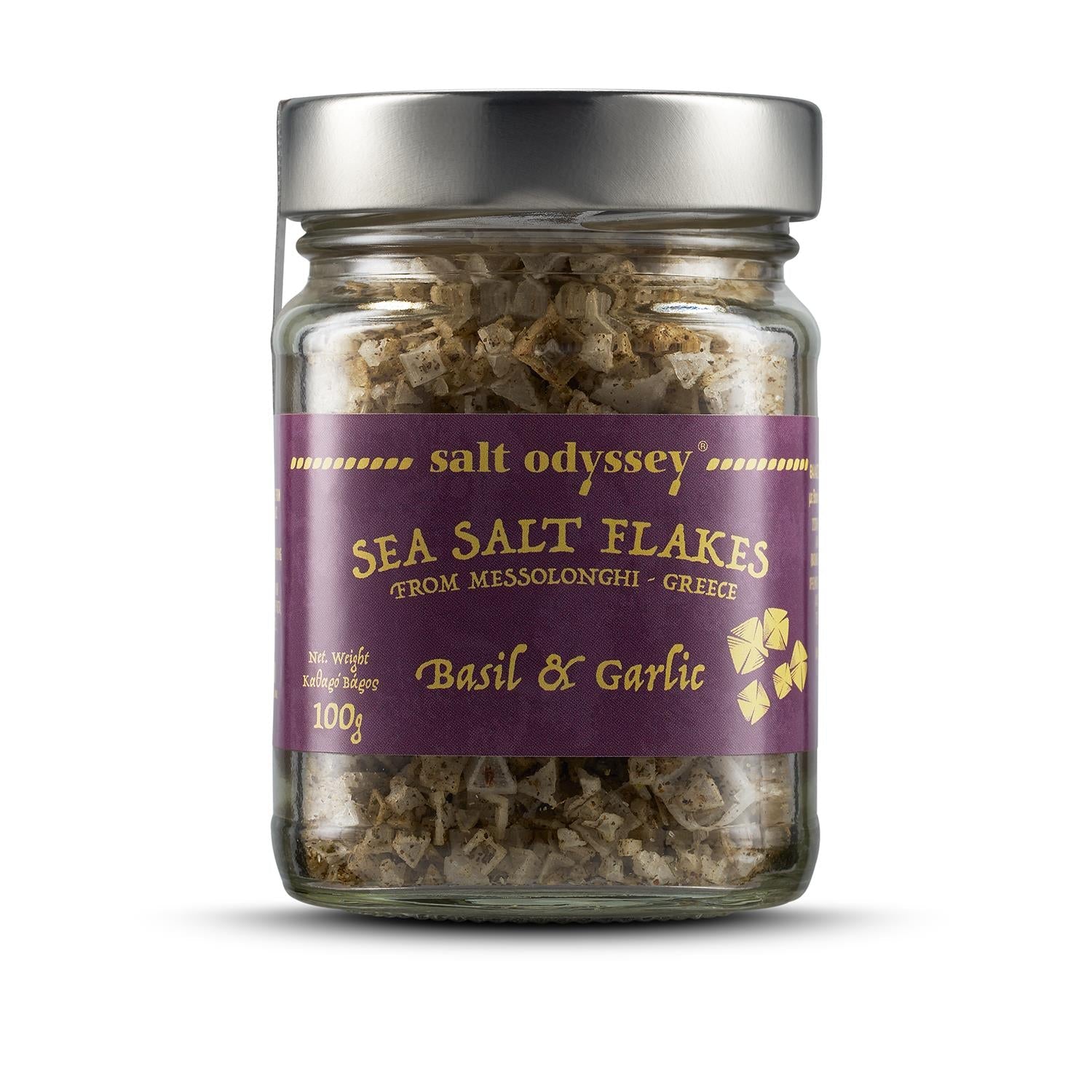 100% sal marina de Mesolongi, ajo en polvo, albahaca