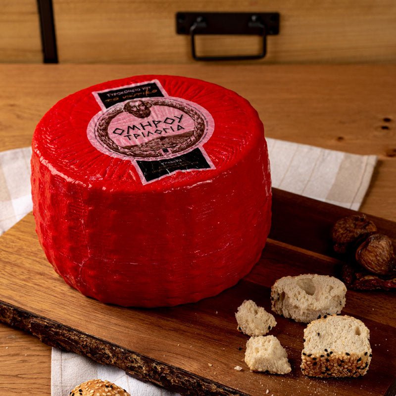 La Trilogía de Homero es un nuevo y exquisito queso Graviera de la isla de Ios. Tiene una textura semidura de color amarillo, con un sabor suave y pleno, fruto de la mezcla de los tres tipos de leche: cabra, oveja, vaca. Representa un excelente maridaje para el vino tinto, ideal para disfrutarlo como queso de mesa. La cabeza entera de queso de 3kg para los que quieren lo mejor de este producto.