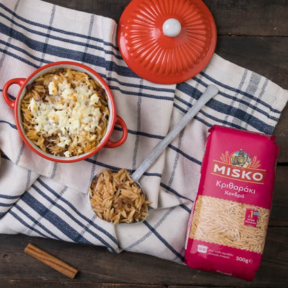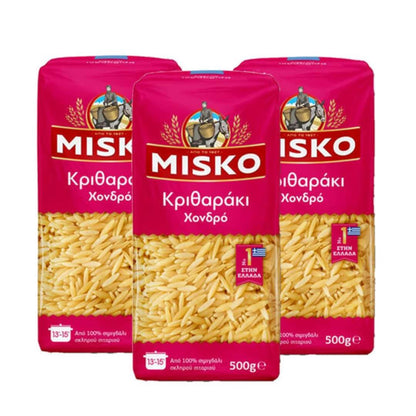 Pasta griega Kritharaki de tamaño grande, caracterizada por ser un ingrediente básico para platos caseros tradicionales, como el conocido y delicioso Giouvetsi, en combinación con carne fresca de ternera o cerdo. En un paquete de 3 piezas de 500gr.