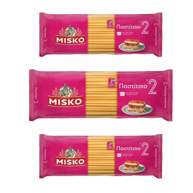 Más allá del Pastitsio, MISKO No2 es un ingrediente versátil para recetas modernas—pruébala en una tarta salada, con una salsa sabrosa, pollo y pimientos, o como una original ensalada de pasta. Ya sea que prepares un plato griego clásico o experimentes con nuevas recetas, esta pasta de primera calidad garantiza una experiencia culinaria y gastronómica excepcional.