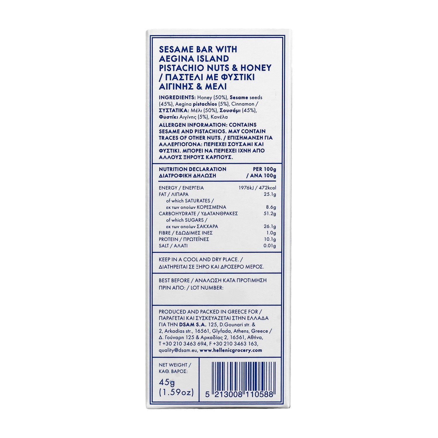 Ingredientes: miel (50%), semillas de sésamo (44,9%), pistachos Aegina (5%), fibra de cítricos canela.