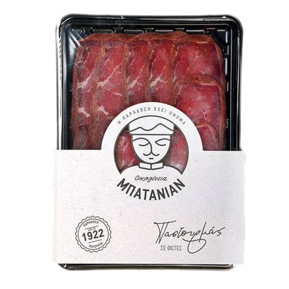 El pastourmas (o pastrami) es un embutido que gusta a todo el mundo. Lo trajeron a Grecia los refugiados de Asia Menor en 1922 y, desde entonces, se ha convertido en una tradición. Básicamente es carne de ternera prensada al aire, cubierta de sal para poder pasteurizarla. En la última parte de su proceso de preparación, se cubre por fuera con una espesa pasta roja hecha de sabrosas especias como ajo, comino y pimentón, y luego comienza el proceso de ahumado, donde adquiere este color burdeos oscuro. Es el embutido perfecto para utilizar en sus «mezedes» de tsipouro y ouzo, ¡pero no sólo! También puede preparar la famosa «Pastourmadopita», que significa pastel de pastrami, mezclándolo con queso y verduras de su elección. Lo consuma como lo consuma, será el centro de atención de su mesa por su sabor y aspecto excepcionales.