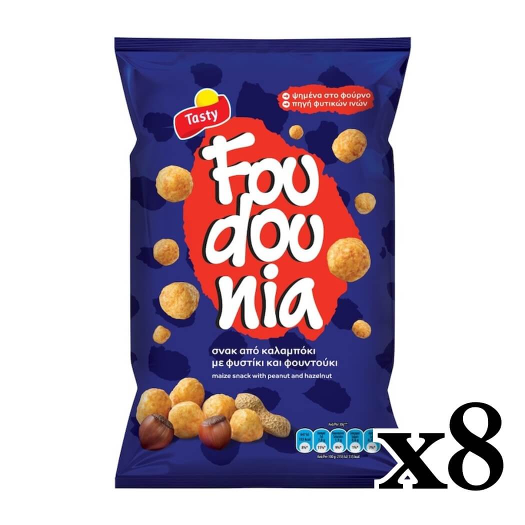 Fountounia son snacks de maíz especiales con un sabor increíble, producidos por Tasty Foods, la primera empresa de aperitivos de Grecia. Son el aperitivo perfecto para acompañar una cerveza con los amigos o para picar mientras se ve una película. Nunca tendrá suficiente de esta pequeña delicia redonda de cacahuete y avellana.