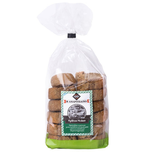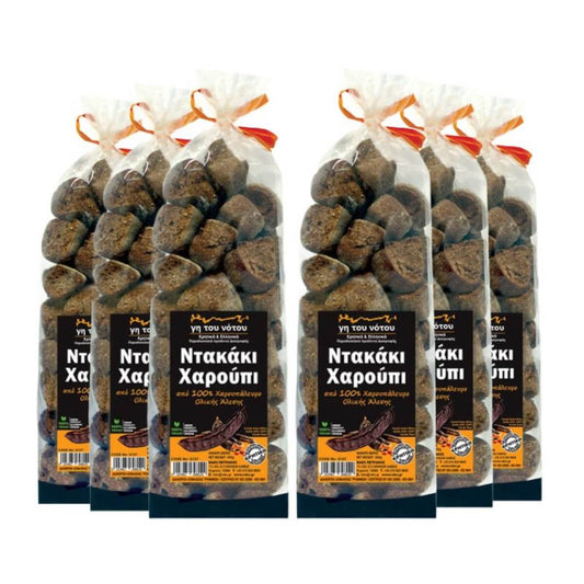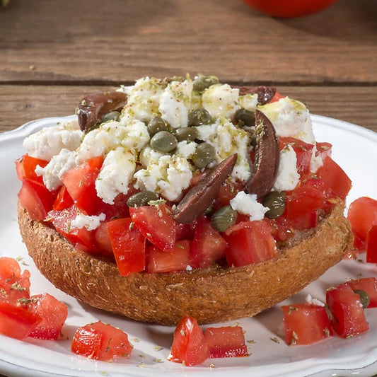 • Paximadia (biscotes cretenses): Los paximadia son biscotes de cebada cocidos dos veces que forman parte de la dieta cretense. Son aperitivos nutritivos, parecidos a los picatostes, con una textura crujiente. Disfrútelos con aceite de oliva, queso feta desmenuzado, orégano y tomates para el clásico dakos, o degústelos como tentempié rápido con sus salsas favoritas, como el tzatziki, y cremas para untar, como la pasta de aceitunas.