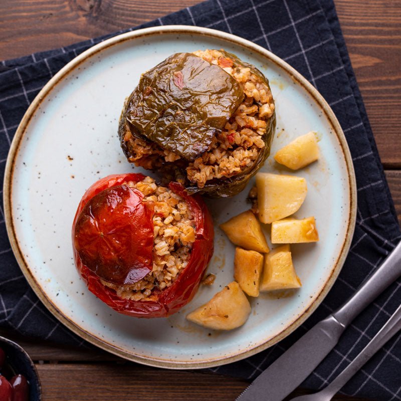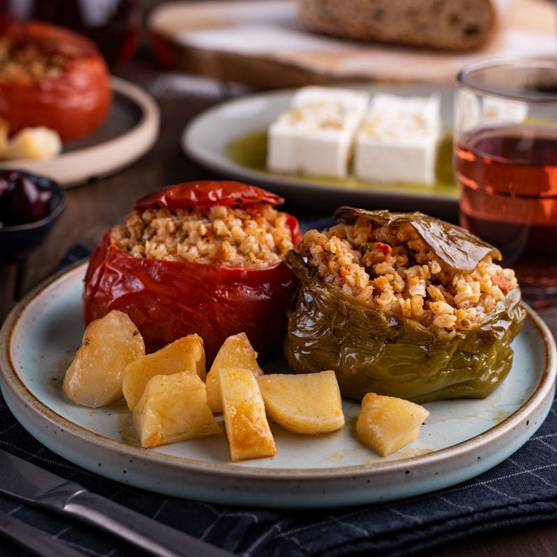 Les grecs Gemista, un mot qui signifie littéralement "farce", sont l'un des plats les plus créatifs de toute la cuisine grecque. A la fois délicieuse et préparée avec des ingrédients simples : tomates, peproni et riz ainsi qu'un mélange d'épices méditerranéennes sont à la base de cette recette. La magie de la recette gemista est que les tomates et les poivrons verts sont farcis d'un mélange d'épices et de riz, créant un résultat extra savoureux et juteux qui a le goût de la Grèce à chaque bouchée ! C'est un plat grec classique qui apparaît dans chaque foyer au moins une fois par semaine, surtout pendant l'été. Il a une grande valeur nutritive et peut être associé à un morceau de feta vieilli en fût pour la plus grande combinaison de saveurs que vous puissiez imaginer !