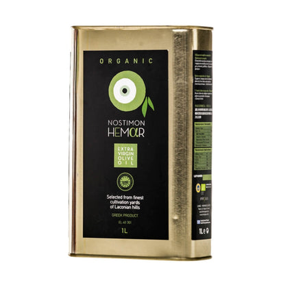 "Nostimon Hemar" est un produit de l'agriculture biologique à partir d'olives sélectionnées des régions autour de Sparte - Laconie. La production de la récolte précoce et de la pression à froid fournit une huile d'olive à faible acidité, avec un taux élevé de polyphénols. Le mélange comprend la présence de 3 variétés, parmi lesquelles prédomine Athinolia. Grâce à cette composition particulière, il a une saveur et un goût uniques avec des caractéristiques d'amertume moyenne.
