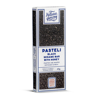 Regalati i classici Pasteli di Sesamo Nero e Miele. Questo tradizionale dolcetto da 45 g combina il valore nutrizionale del sesamo nero, ricco di calcio, e del miele greco al 100% per un equilibrio di dolce e salato. Ogni boccone include un pizzico di cannella per un tocco di sapore in più. Goditi una delizia senza tempo con Pastelli di sesamo nero e miele.