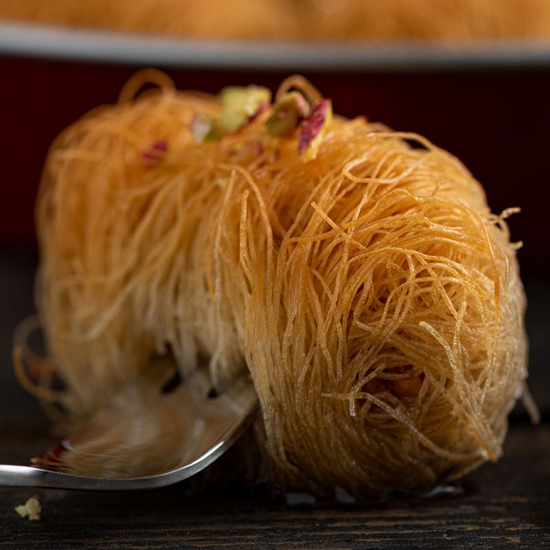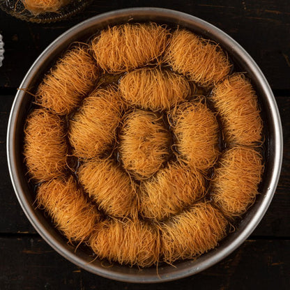 Scopri il Kataifaki Greco Tradizionale, il dolce greco per eccellenza: fili sottilissimi di pasta kataifi avvolti attorno a un morbido ripieno di noci, spennellati con burro, cotti fino a diventare croccanti e infine immersi nel classico sciroppo profumato.